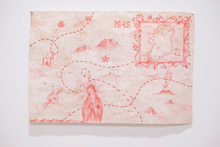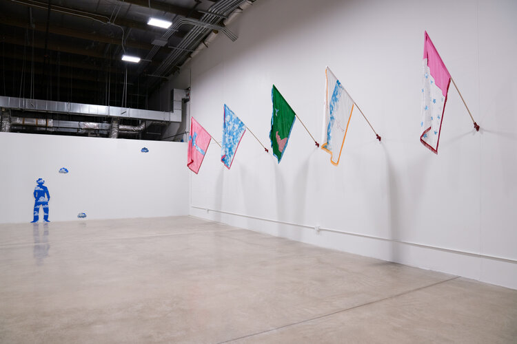 Her eye-catching maps and elegant flags inhabit a liminal space (a terrain both real and imagined) spoken through layered fabrics, hand-drawn forms, and desert-born color palettes.